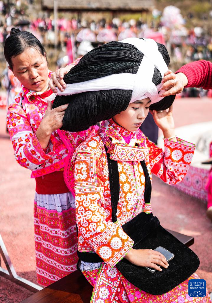 2月26日,在貴州省六盤水市六枝特區(qū)梭戛苗族彝族回族鄉(xiāng)高興村跳花場(chǎng),苗族姑娘在整理頭飾。