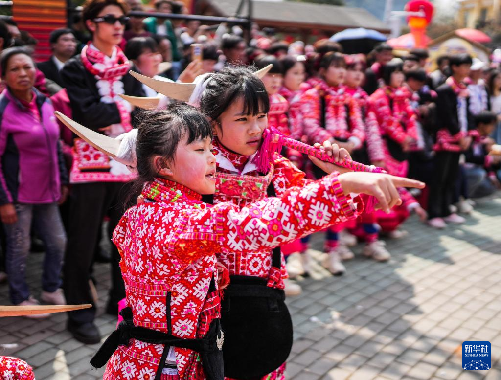 2月26日,在貴州省六盤水市六枝特區(qū)梭戛苗族彝族回族鄉(xiāng)高興村跳花場(chǎng),小朋友們?cè)谶M(jìn)行巡游。