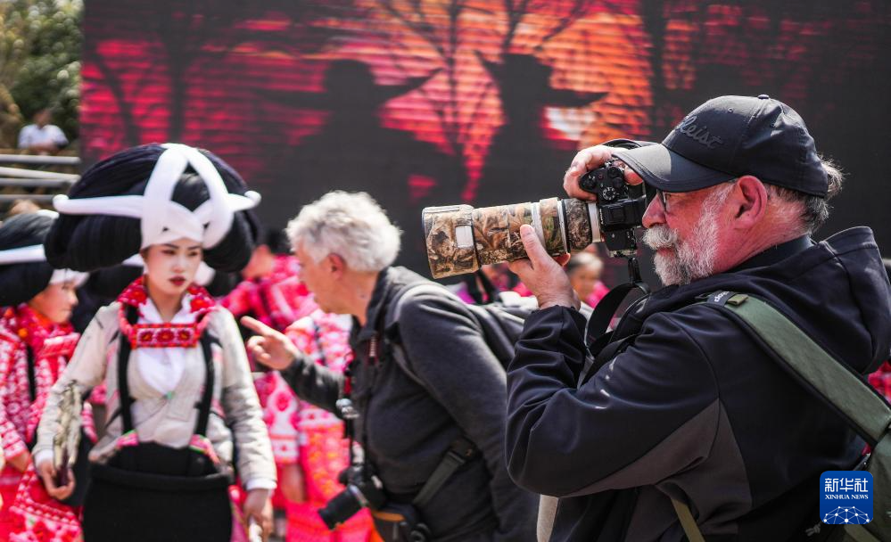 2月26日,在貴州省六盤水市六枝特區(qū)梭戛苗族彝族回族鄉(xiāng)高興村跳花場(chǎng),國(guó)外游客在拍照。