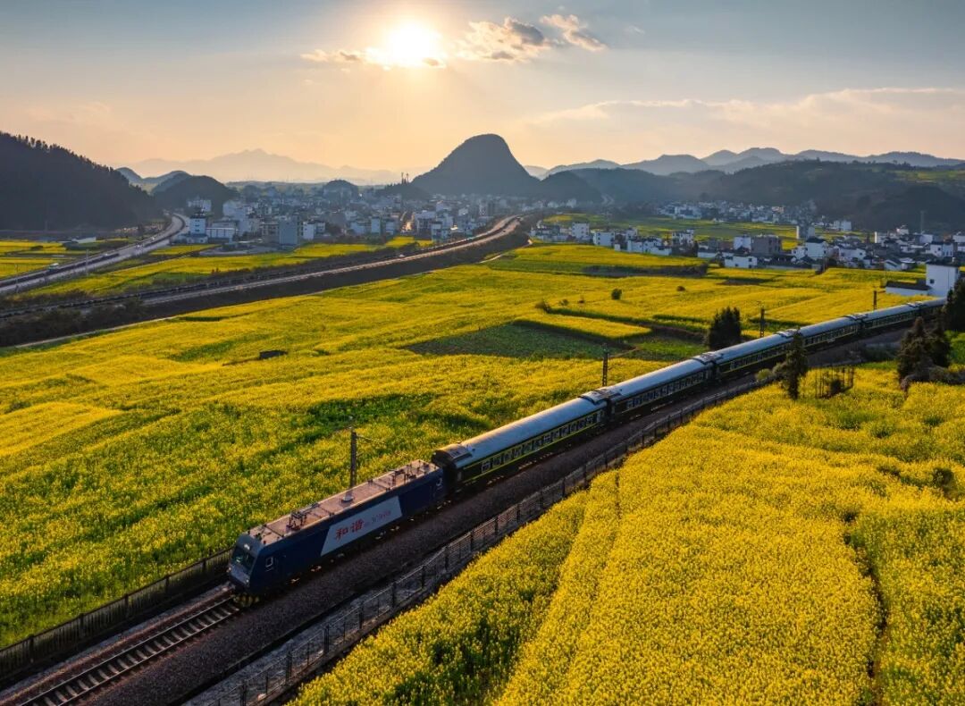 南昆鐵路的春運旅途,被羅平的油菜花海溫柔包圍。暖陽下,列車如游龍穿梭在無邊金浪里,花潮隨春風(fēng)起伏,暈染出層層柔光。遠(yuǎn)山含黛,村落隱在花影間,花香混著歸鄉(xiāng)的期盼,讓每一段歸途都盛滿春日的浪漫與溫暖。