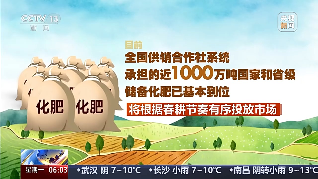 目前,全國供銷合作社系統(tǒng)承擔的近1000萬噸國家和省級儲備化肥已基本到位,將根據(jù)春耕節(jié)奏有序投放市場。