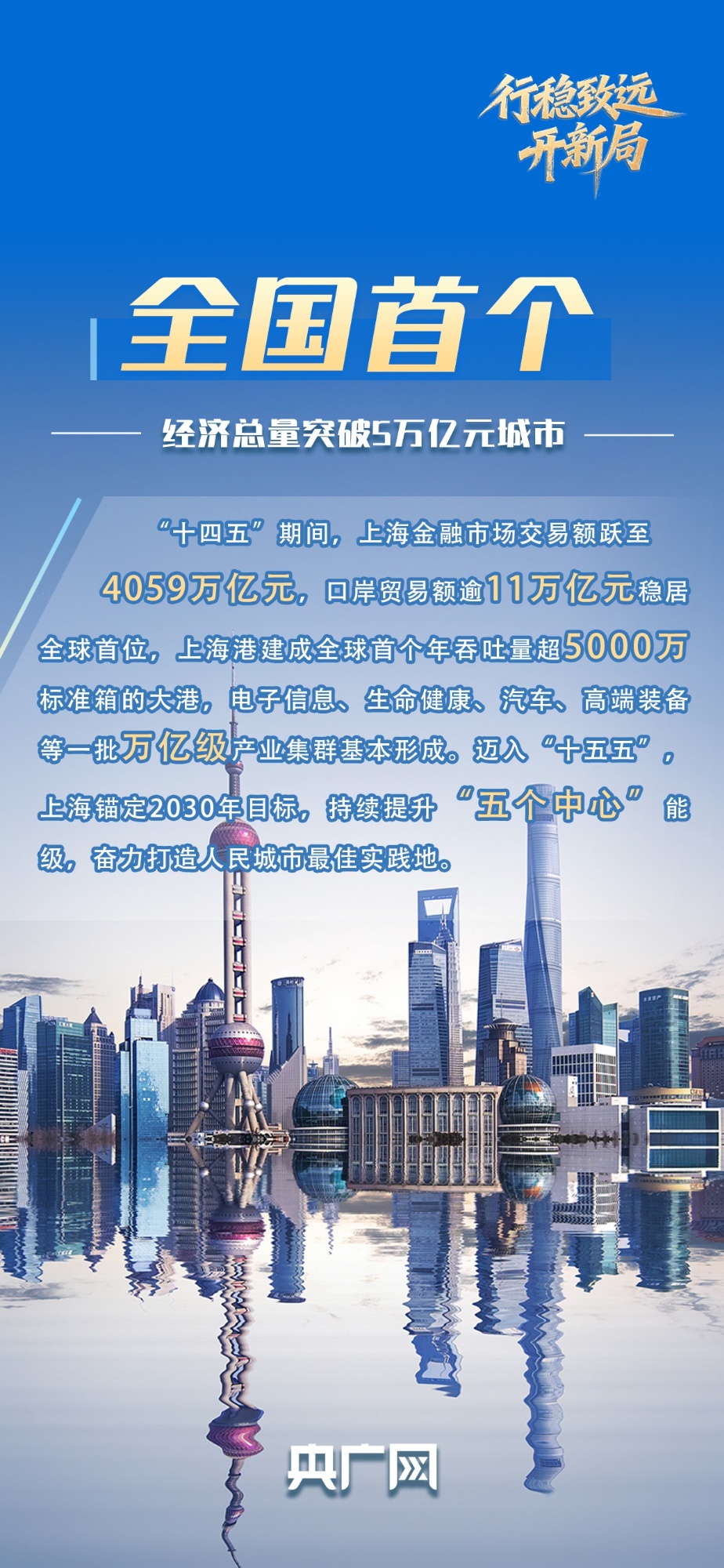 “十四五”期間,上海聚焦建設(shè)國際經(jīng)濟(jì)中心、金融中心、貿(mào)易中心、航運中心、科技創(chuàng)新中心的重要使命,綜合實力實現(xiàn)新跨越。全市生產(chǎn)總值從4.16萬億元增加到5.67萬億元,成為全國首個經(jīng)濟(jì)總量突破5萬億元的城市,躋身全球城市前五位。成績單背后,既是上?!拔鍌€中心”建設(shè)的階段性成效,更是“十五五”期間邁向更高能級的底氣所在。