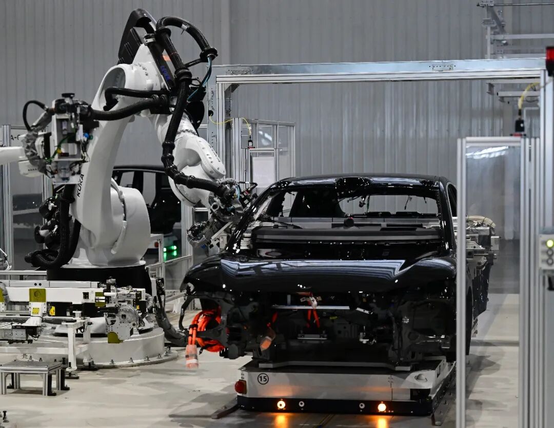 圖為記者在安徽合肥市新橋智能電動(dòng)汽車產(chǎn)業(yè)園蔚來第二工廠拍攝的新能源汽車生產(chǎn)線。新華社記者周牧攝