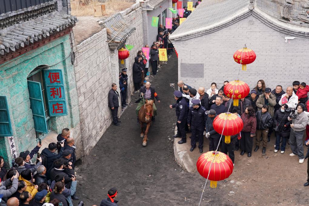 3月4日,農(nóng)歷正月十六,這個(gè)距離娘子關(guān)僅6公里的小山村,迎來了一年中最熱鬧的時(shí)刻,村中那條長約400米、寬不足4米的青石古巷上,里三層外三層擠滿了人。沿路民房的臺階上、門檻上,甚至屋頂上,都早已站上了不請自來的看客,主人家卻也毫不在意:“今天這個(gè)大日子,大家一起熱鬧熱鬧!”