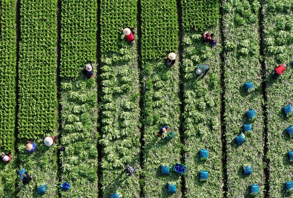 2026年2月24日,農(nóng)民在四川彭州市九尺鎮(zhèn)玉源社區(qū)的田地里采收油麥菜(無(wú)人機(jī)照片)。新華社發(fā)(羅國(guó)楊 攝)