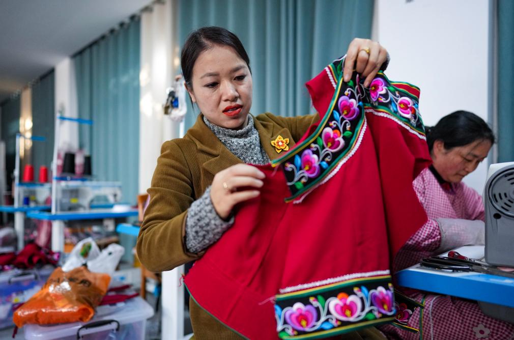 金瑞瑞在自己的工作室內(nèi)查看彝繡服飾。新華社記者 陳欣波 攝