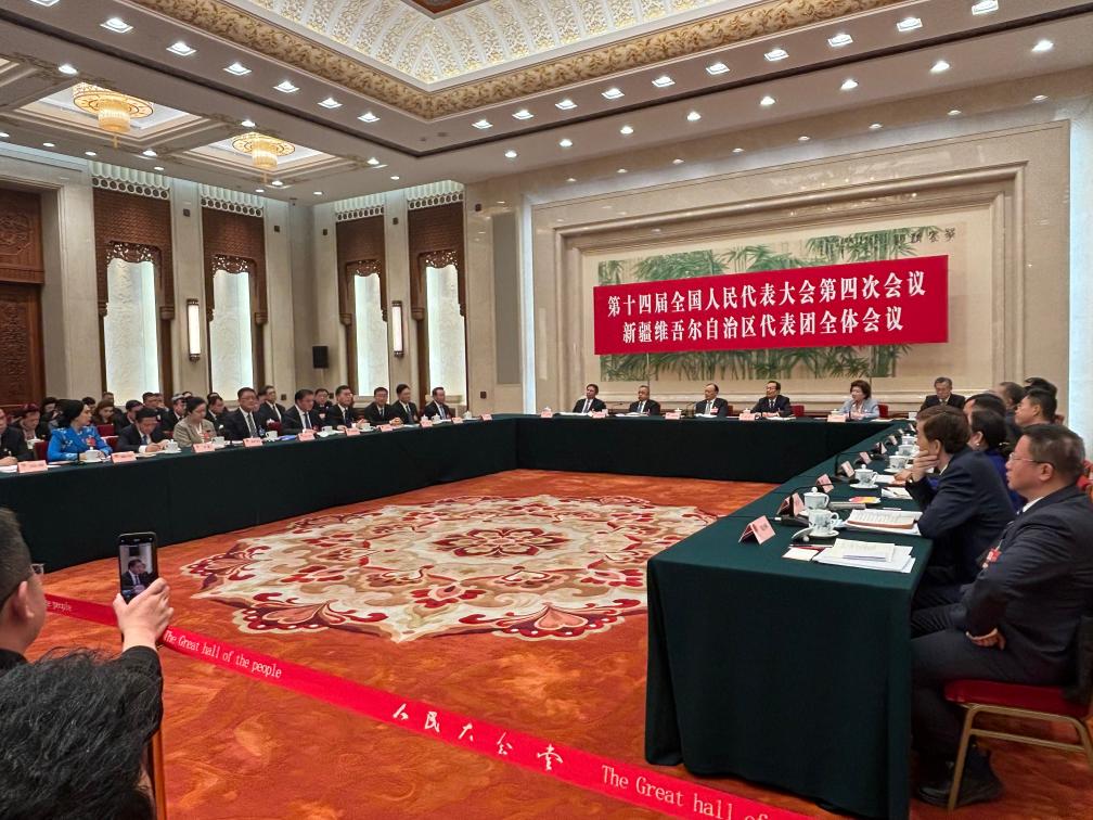 十四屆全國人大四次會(huì)議新疆維吾爾自治區(qū)代表團(tuán)全體會(huì)議現(xiàn)場(chǎng)。新華社記者 劉雅萱 攝