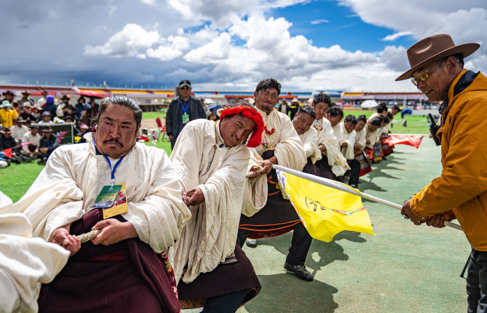 2025年9月6日,在那曲市恰青賽馬節(jié)現(xiàn)場,農(nóng)牧民參加拔河比賽。新華社記者 丁增尼達 攝