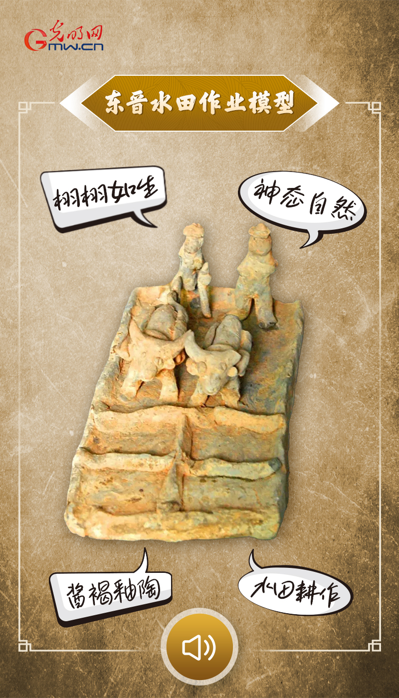“我凝聚著東晉的農(nóng)耕智慧,1989年于韶關(guān)北江中學(xué)重見天日。醬褐釉陶的身軀里,藏著古人順天時(shí)、量地利的自然哲思,田埂分野的水田里,一牛一人循著春時(shí)耕作,不違農(nóng)時(shí)、順應(yīng)天地,脫離了原始耕作的粗獷,以精耕細(xì)作的姿態(tài)融于自然。我是千年前嶺南人與自然和諧共生的見證,聽,那犁耙劃過田泥的聲響,還在訴說著順應(yīng)自然時(shí)節(jié)的農(nóng)耕故事?!?/p>