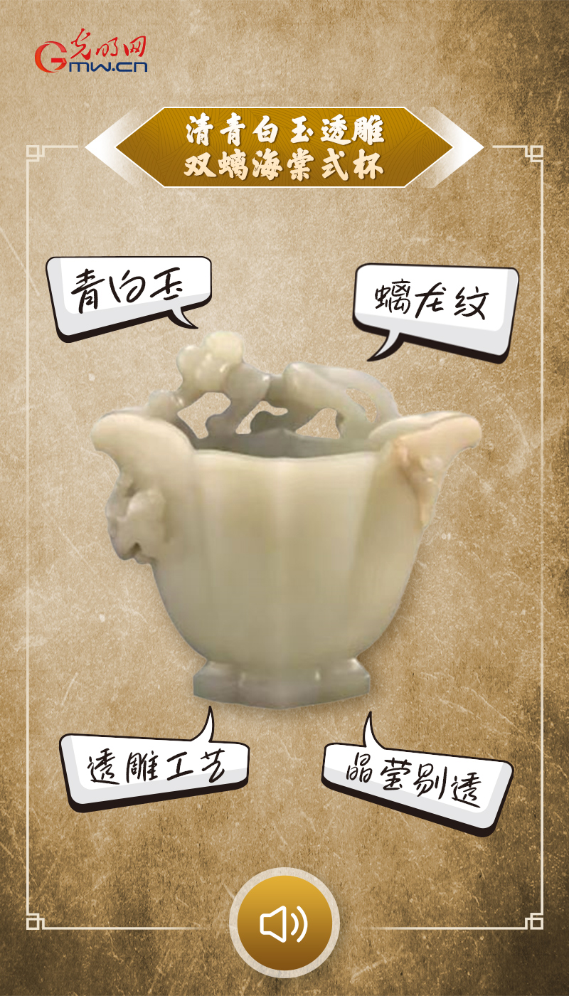 “我是乾隆年間的青白玉精靈,靜臥于廈門市博物館。青白玉的溫潤肌理,映著海棠花信的婉約,四出海棠式的杯身,似春分時(shí)節(jié)綻露的海棠芳姿,透雕的雙螭繞身,與海棠相映成趣,將春日的靈動與秀美凝于玉間。曾是清代宮廷的御用茶具,玉杯盛水,便如攬盡春分海棠的滿園春色,你可以能從我的晶瑩剔透中,望見千百年前春分時(shí)節(jié)的海棠勝景。”