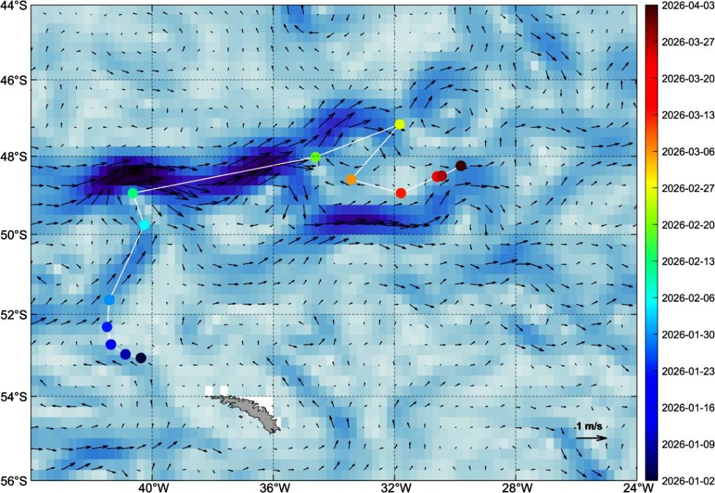 風云衛(wèi)星監(jiān)測的A23a冰山漂移路徑(圓點為冰山位置,時間與右側(cè)標注對應;圖底色和箭頭表示洋流)。(中國氣象局供圖)