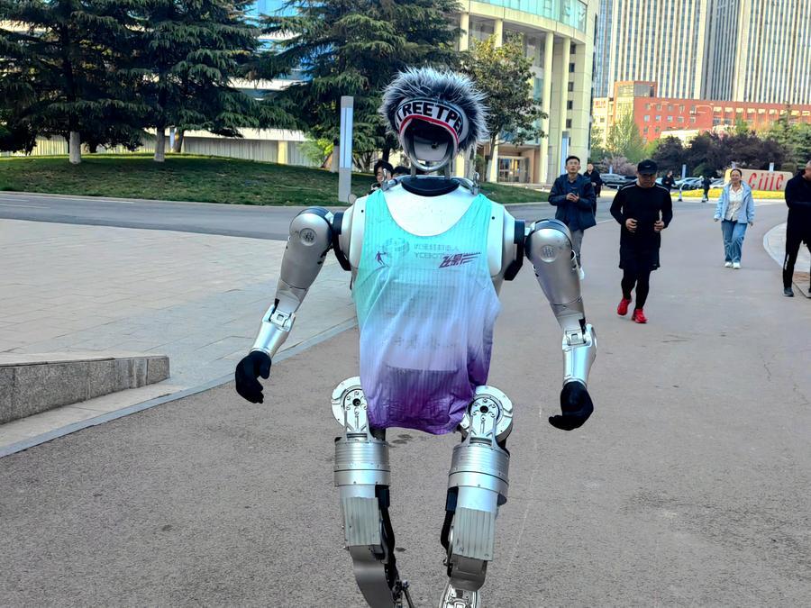 山東優(yōu)寶特智能機(jī)器人有限公司研制的人形機(jī)器人“行者泰山”進(jìn)行馬拉松訓(xùn)練。新華社發(fā)