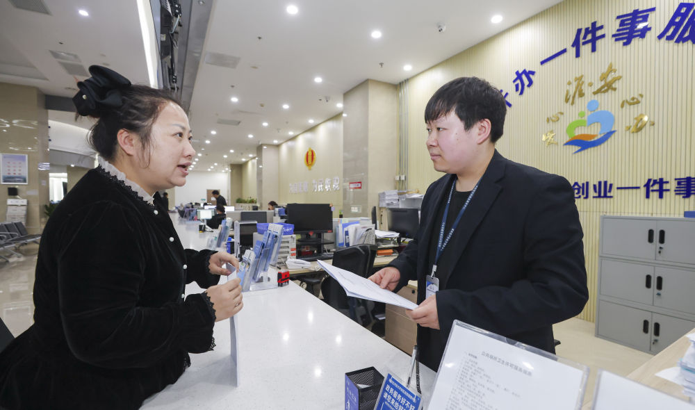 2026年4月9日,在江蘇淮安經(jīng)濟(jì)技術(shù)開發(fā)區(qū)政務(wù)服務(wù)中心,市民(左)向工作人員咨詢營業(yè)執(zhí)照經(jīng)營范圍、辦理流程等信息。