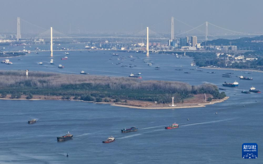 船只行駛在長江南京段(2025年11月18日攝,無人機照片)。新華社記者 李博 攝
