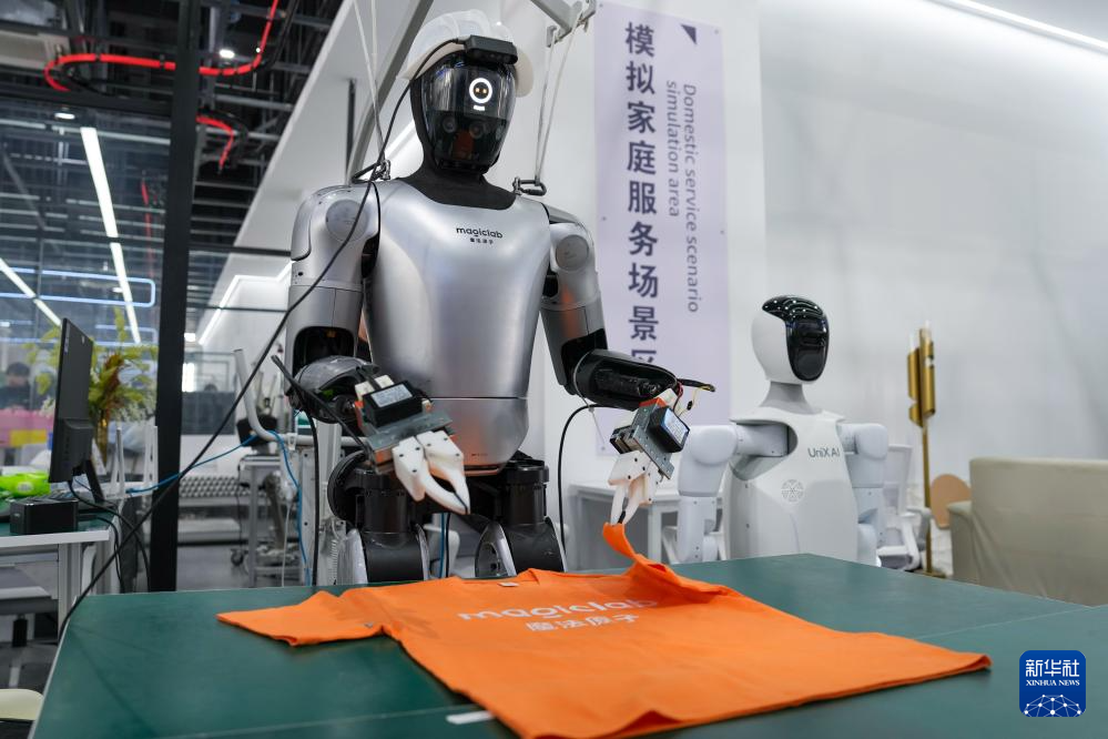 在蘇州市具身智能機器人綜合創(chuàng)新中心,機器人在模擬家庭服務場景內疊衣服(2026年3月10日攝)。新華社記者 李博 攝