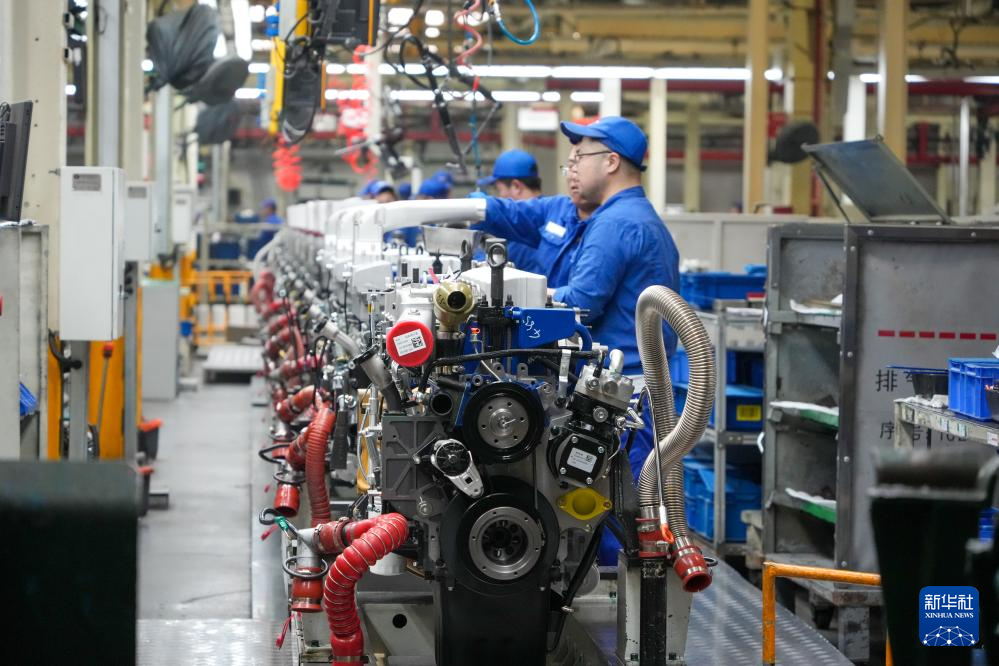 在濰柴動力總裝車間,工作人員在發(fā)動機生產(chǎn)線作業(yè)(3月27日攝)。新華社記者 徐速繪 攝