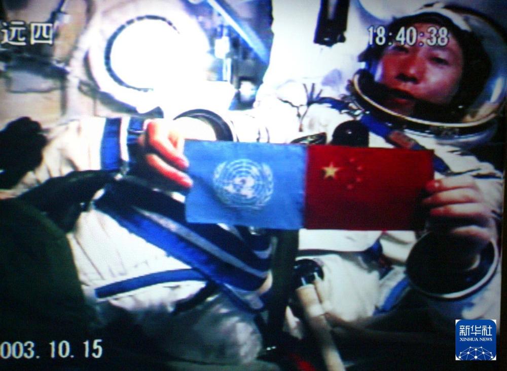 2003年10月15日18時(shí)40分,航天員楊利偉從太空向世界各國(guó)人民問(wèn)好,并在艙內(nèi)并列展示了五星紅旗和聯(lián)合國(guó)旗(攝于北京航天指揮控制中心大屏幕)。新華社發(fā)