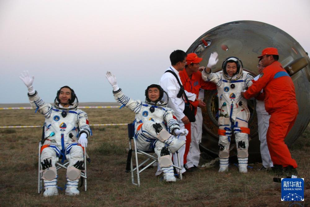 2008年9月28日,神舟七號(hào)返回地球,航天員翟志剛、劉伯明、景海鵬(從左至右)自主出艙后向現(xiàn)場(chǎng)搜救人員揮手致意。 新華社記者 王建民 攝