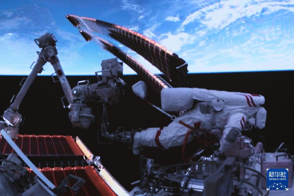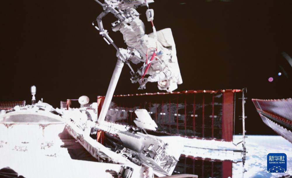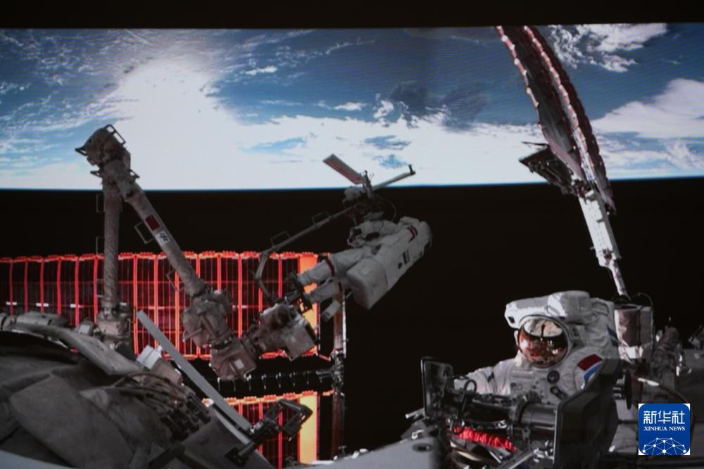 2024年5月28日在北京航天飛行控制中心拍攝的神舟十八號(hào)航天員葉光富在空間站組合體艙外作業(yè)的畫(huà)面。新華社記者 李杰 攝