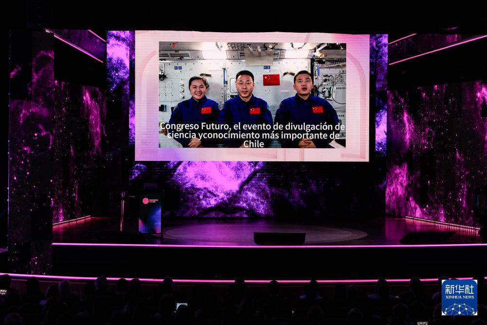 2025年1月13日,智利第十四屆“未來(lái)大會(huì)”開(kāi)幕式在首都圣地亞哥舊國(guó)會(huì)大廈內(nèi)舉行,神舟十九號(hào)乘組通過(guò)視頻送上祝福,預(yù)祝大會(huì)取得圓滿成功,并表達(dá)了中國(guó)和智利及拉美攜手探索宇宙奧秘的美好愿望。新華社發(fā)(豪爾赫·比列加斯 攝)