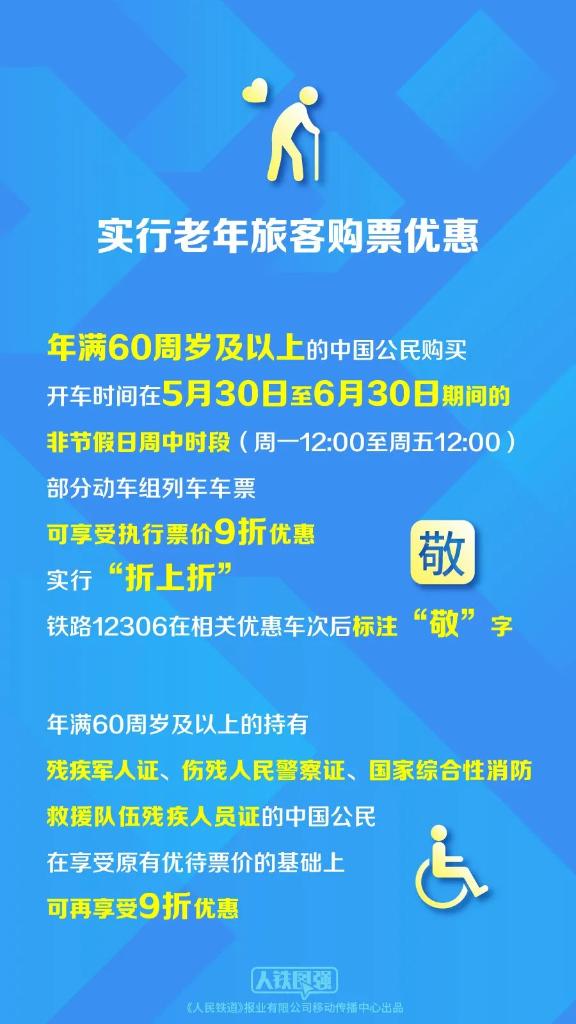 年滿60周歲及以上的中國(guó)公民購(gòu)買開車時(shí)間在5月30日至6月30日期間的非節(jié)假日周中時(shí)段(周一12:00至周五12:00)部分動(dòng)車組列車車票,可享受執(zhí)行票價(jià)9折優(yōu)惠,實(shí)行“折上折”,鐵路12306在相關(guān)優(yōu)惠車次后標(biāo)注“敬”字;年滿60周歲及以上的持有殘疾軍人證、傷殘人民警察證、國(guó)家綜合性消防救援隊(duì)伍殘疾人員證的中國(guó)公民,在享受原有優(yōu)待票價(jià)的基礎(chǔ)上,可再享受9折優(yōu)惠。老年旅客可同時(shí)享受普通常旅客會(huì)員的三倍積分優(yōu)惠,積分可用于兌換火車票或辦理座位升級(jí)業(yè)務(wù)。