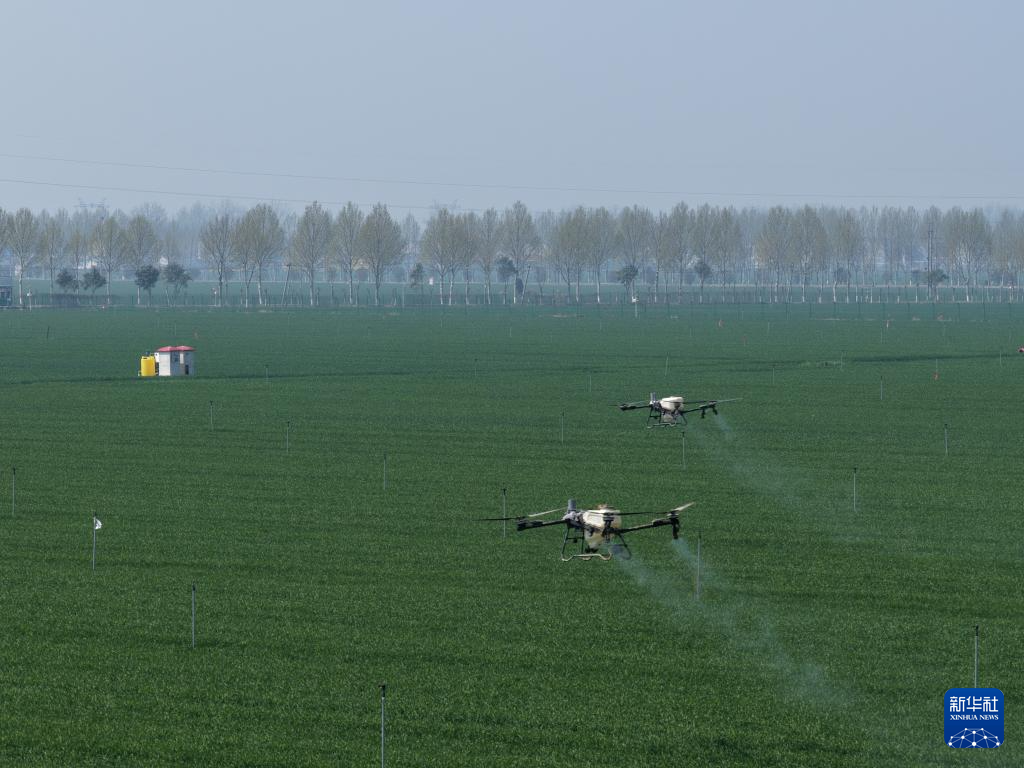 4月1日,飛防無人機(jī)在河南周口國(guó)家農(nóng)高區(qū)小麥高產(chǎn)創(chuàng)建示范田作業(yè)(無人機(jī)照片)。新華社記者 李嘉南 攝