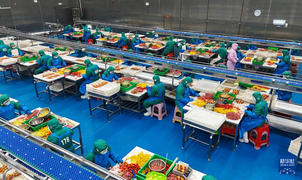 工作人員在河南鹿邑縣茂源肉業(yè)穿串車間作業(yè)(資料照片)。新華社發(fā)