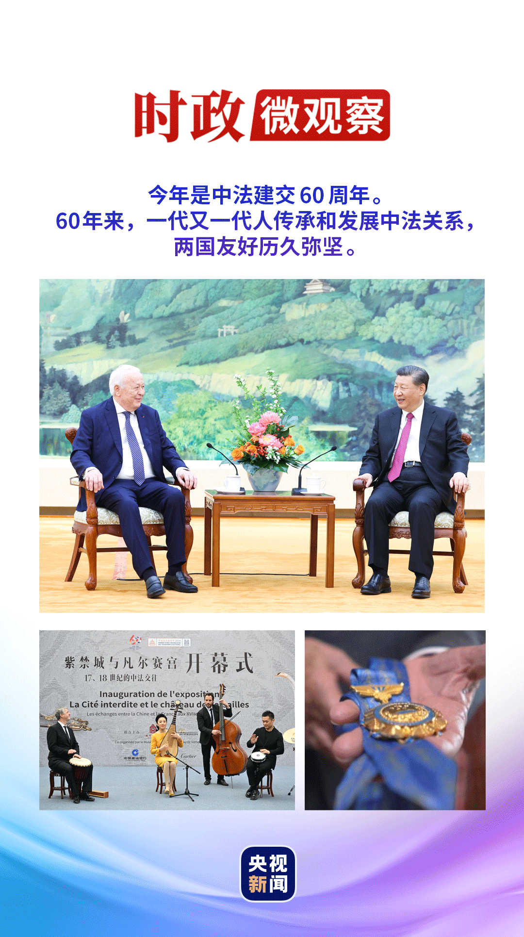 今年4月8日,再次會見中國人民這位老朋友,習(xí)近平主席撫今追昔:“60年來,一代又一代人傳承和發(fā)展中法關(guān)系,兩國友好歷久彌堅。中方珍視中法友誼,愿同法方進一步加強高層交往,密切交流合作,推動中法關(guān)系邁上更高水平?!?/p>