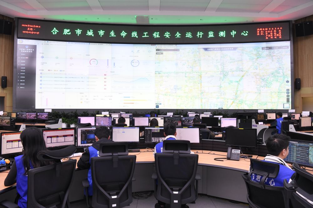 技術人員在位于清華大學合肥公共安全研究院的合肥市城市生命線工程安全運行監(jiān)測中心值守(2024年4月8日攝)。合肥市2015年啟動城市生命線安全工程建設,逐步構建燃氣、橋梁、供水、排水、熱力、綜合管廊、消防、水環(huán)境八大領域立體化監(jiān)測網(wǎng),探索出一條以場景應用為依托、以智慧防控為導向、以創(chuàng)新驅動為內核、以市場運作為抓手的城市安全發(fā)展新模式。