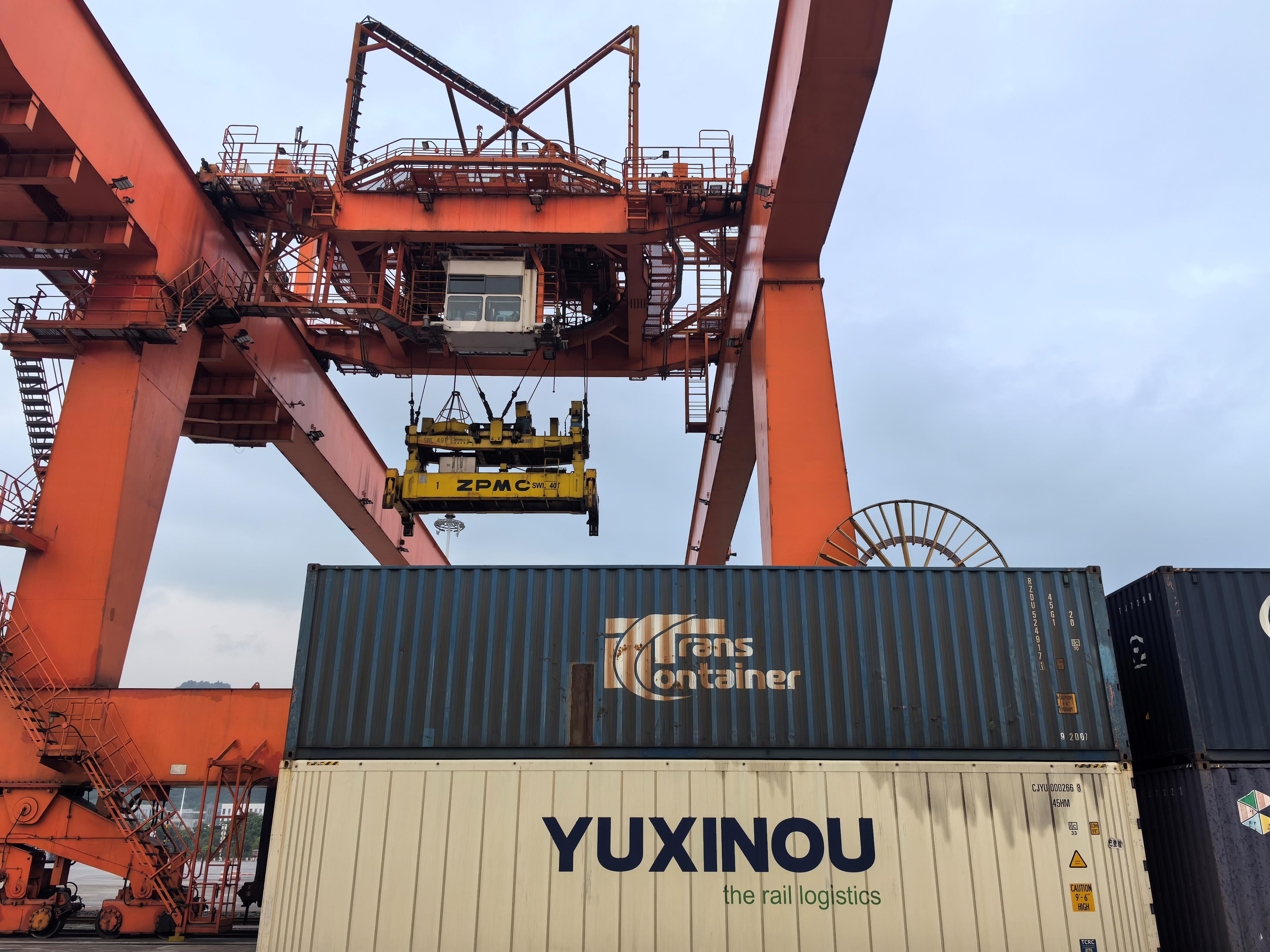 重慶國際物流樞紐園區(qū)內(nèi),中歐班列運(yùn)送的“渝新歐”集裝箱整齊排列。(總臺(tái)央廣記者潘毅拍攝)