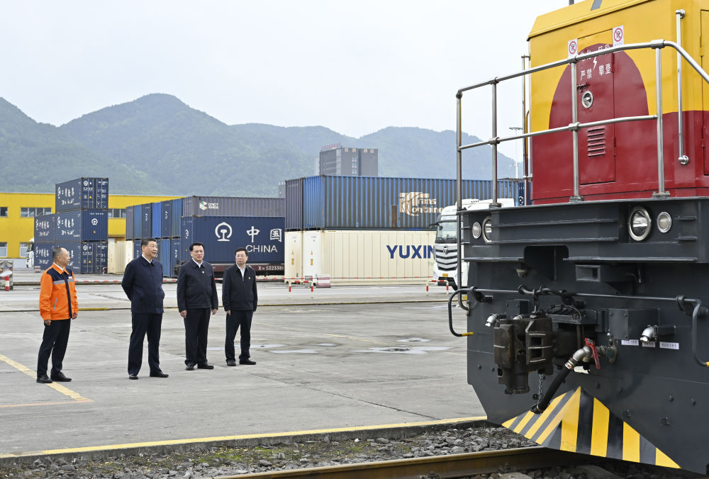2024年4月22日,習(xí)近平總書(shū)記來(lái)到重慶國(guó)際物流樞紐園區(qū),了解當(dāng)?shù)丶涌旖ㄔO(shè)西部陸海新通道等情況。在一列滿(mǎn)載貨物的中歐班列前,習(xí)近平總書(shū)記駐足察看。新華社記者 岳月偉 攝