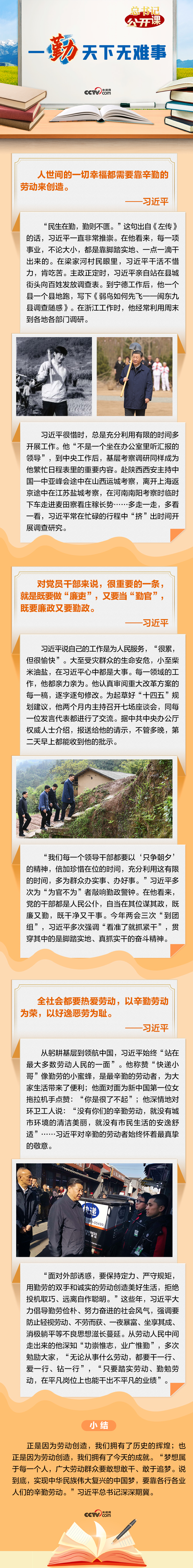 習(xí)近平總書記強(qiáng)調(diào),“一勤天下無難事”,“實(shí)現(xiàn)中華民族偉大復(fù)興的中國夢(mèng),要靠各行各業(yè)人們的辛勤勞動(dòng)”。“勤”是貫穿總書記從政生涯的品質(zhì),是對(duì)他夙夜在公、勤勉工作最為凝練的概括。