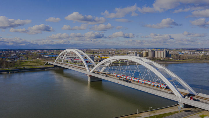 △2024年3月12日,一列火車(chē)運(yùn)行在匈塞鐵路塞爾維亞境內(nèi)貝諾段諾維薩德多瑙河大橋上。