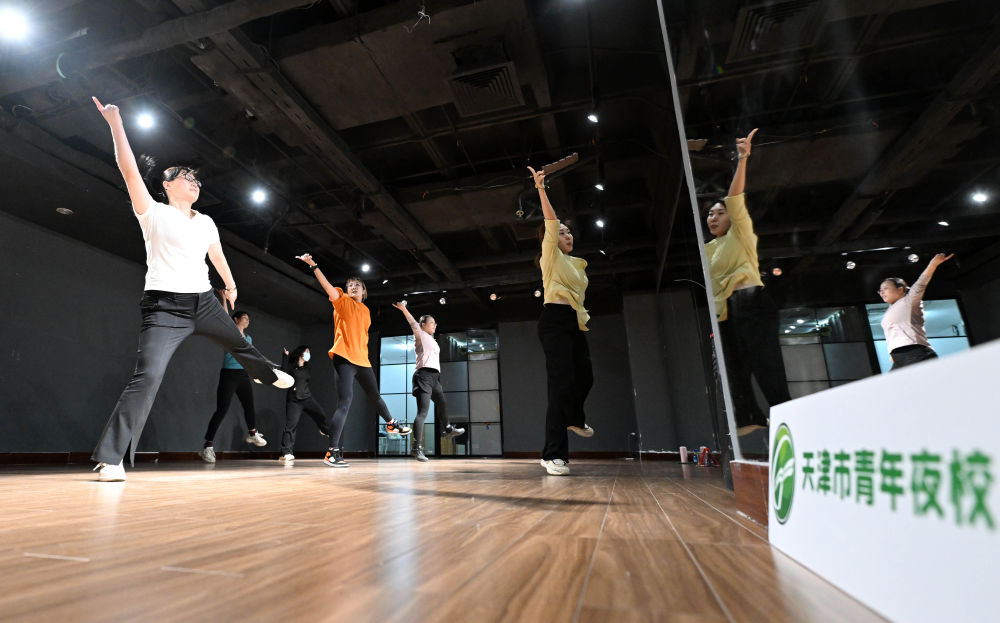 在天津青年宮,學(xué)員在青年夜校練習(xí)有氧健身舞(2024年4月23日攝)?!⌒氯A社記者 趙子碩 攝