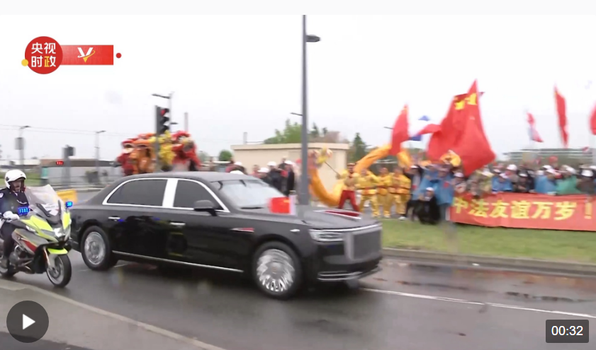 當?shù)貢r間5月5日下午,國家主席習近平乘專機抵達巴黎。從機場前往下榻酒店途中,包括華人華僑和中國留學生代表在內的歡迎人群揮舞著中法兩國國旗,敲鑼打鼓,舞龍舞獅,熱烈歡迎習近平主席到訪。