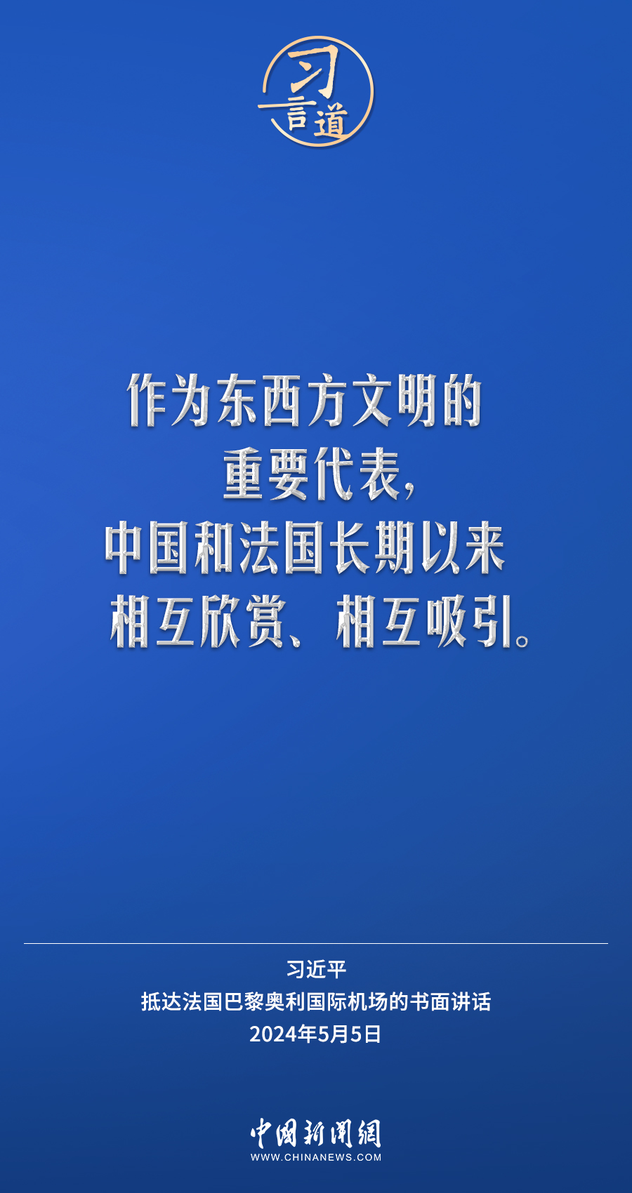 當(dāng)?shù)貢r(shí)間5月5日下午,國(guó)家主席習(xí)近平抵達(dá)巴黎,開(kāi)始對(duì)法國(guó)進(jìn)行國(guó)事訪問(wèn)。在抵達(dá)法國(guó)巴黎奧利國(guó)際機(jī)場(chǎng)的書(shū)面講話中,習(xí)近平指出——