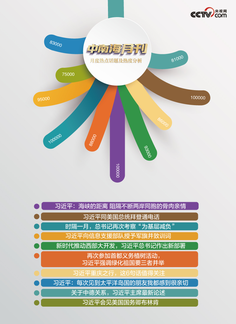 央視網(wǎng)“智聞”系統(tǒng)提取分析2024年4月全網(wǎng)時(shí)政新聞熱點(diǎn)顯示,“時(shí)隔一月,總書(shū)記再次考察‘為基層減負(fù)’”“習(xí)近平向信息支援部隊(duì)授予軍旗并致訓(xùn)詞”“習(xí)近平同美國(guó)總統(tǒng)拜登通電話(huà)”等話(huà)題備受關(guān)注。