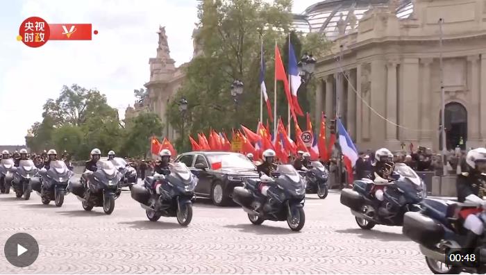 當?shù)貢r間5月6日下午,歡迎儀式后,習近平主席和夫人彭麗媛在共和國衛(wèi)隊148名騎兵組成的禮兵馬隊和摩托車隊護衛(wèi)下,乘車前往愛麗舍宮。