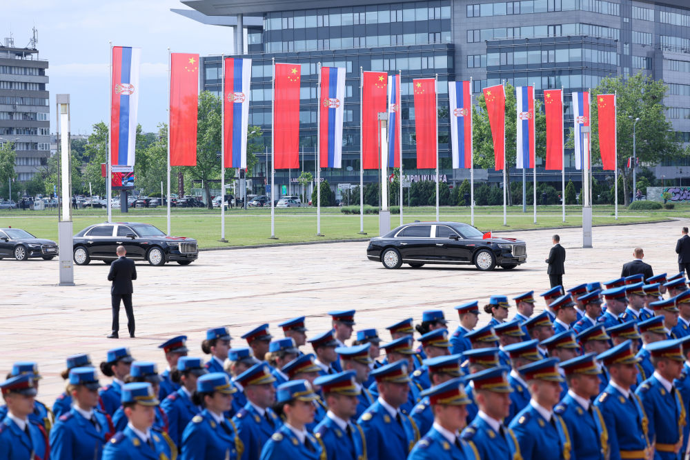 當(dāng)?shù)貢r間5月8日,國家主席習(xí)近平在貝爾格萊德出席塞爾維亞總統(tǒng)武契奇舉行的隆重盛大歡迎儀式。歡迎儀式在塞爾維亞大廈南廣場舉行。兩國元首共同登上檢閱臺,軍樂團奏響中塞兩國國歌,鳴10響禮炮。習(xí)近平在武契奇陪同下檢閱儀仗隊。