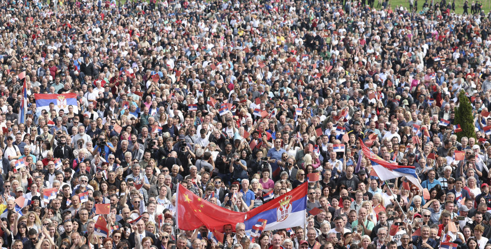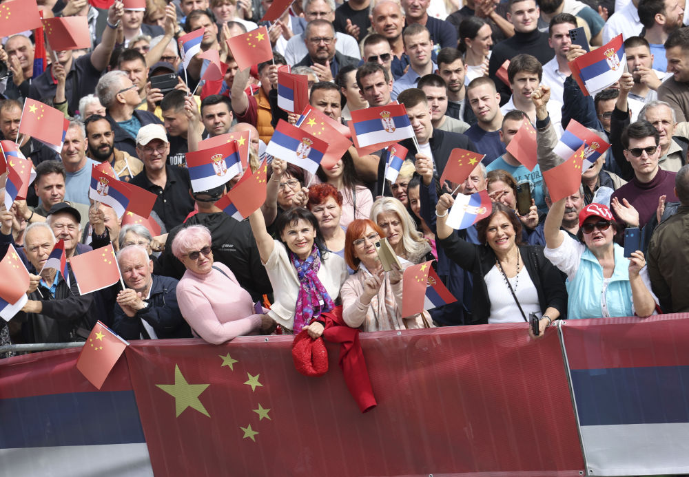 大廈廣場上,一萬五千名塞爾維亞民眾揮舞中塞兩國國旗,對習(xí)近平表示最熱烈的歡迎。
