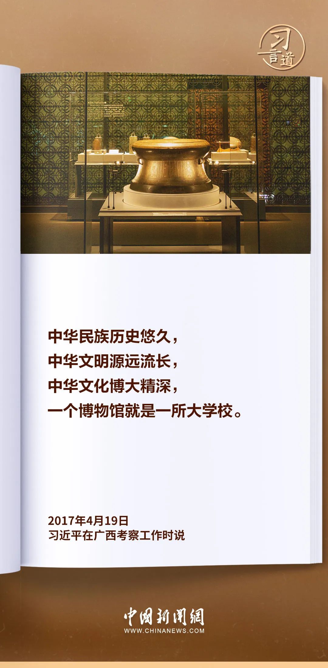 一個博物館就是一所大學(xué)校。習(xí)近平總書記高度重視博物館工作,多次發(fā)表重要論述,強(qiáng)調(diào)要積極推進(jìn)文物保護(hù)利用和文化遺產(chǎn)保護(hù)傳承。