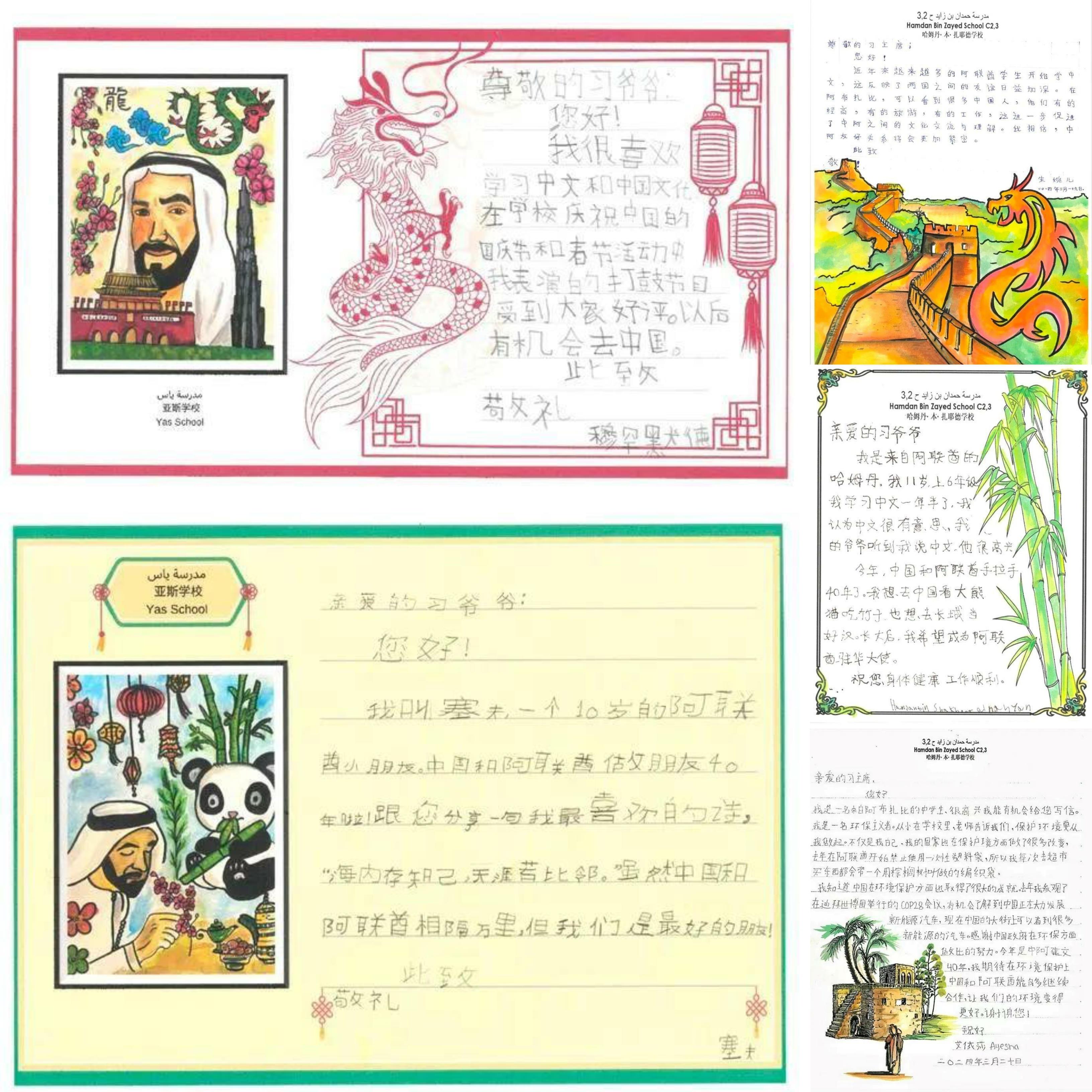 不久前,40封書信從阿聯(lián)酋哈姆丹·本·扎耶德學校、亞斯學校寄往北京,收件人是習近平主席。在這些信箋里,孩子們用中文一筆一畫講述著中阿友好的故事。他們是阿聯(lián)酋中文教學“百校項目”學生代表,代表著阿聯(lián)酋171所開設中文課程的學校中7.1萬名學習中文的學生。
