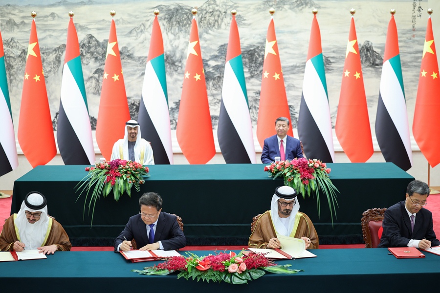 5月30日下午,國家主席習(xí)近平在北京人民大會(huì)堂同來華國事訪問并出席中國-阿拉伯國家合作論壇第十屆部長級(jí)會(huì)議開幕式的阿聯(lián)酋總統(tǒng)穆罕默德舉行會(huì)談。這是會(huì)談后,兩國元首共同見證簽署多項(xiàng)雙邊合作文件。新華社記者 劉彬 攝