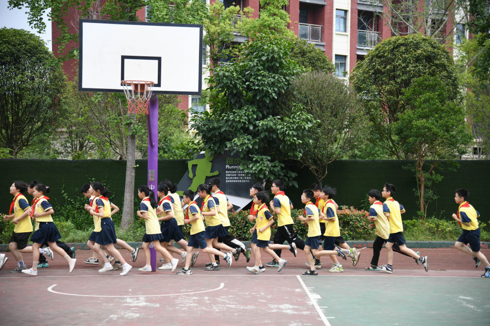 5月31日,學(xué)生在體育課上跑步。