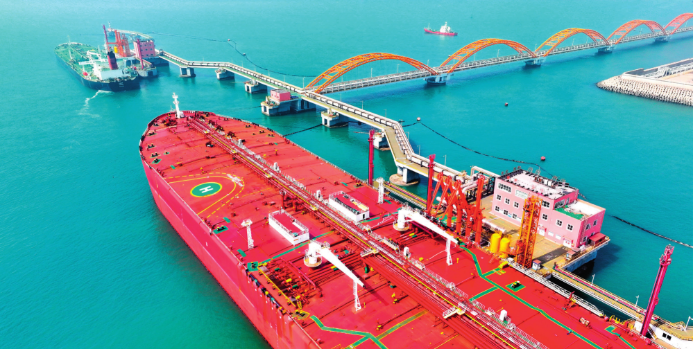 在山東港口日照港嵐山港區(qū)30 萬(wàn)噸級(jí)油品碼頭,船舶停靠進(jìn)行卸油作業(yè)(2024年3月29日攝)郭緒雷攝 / 本刊