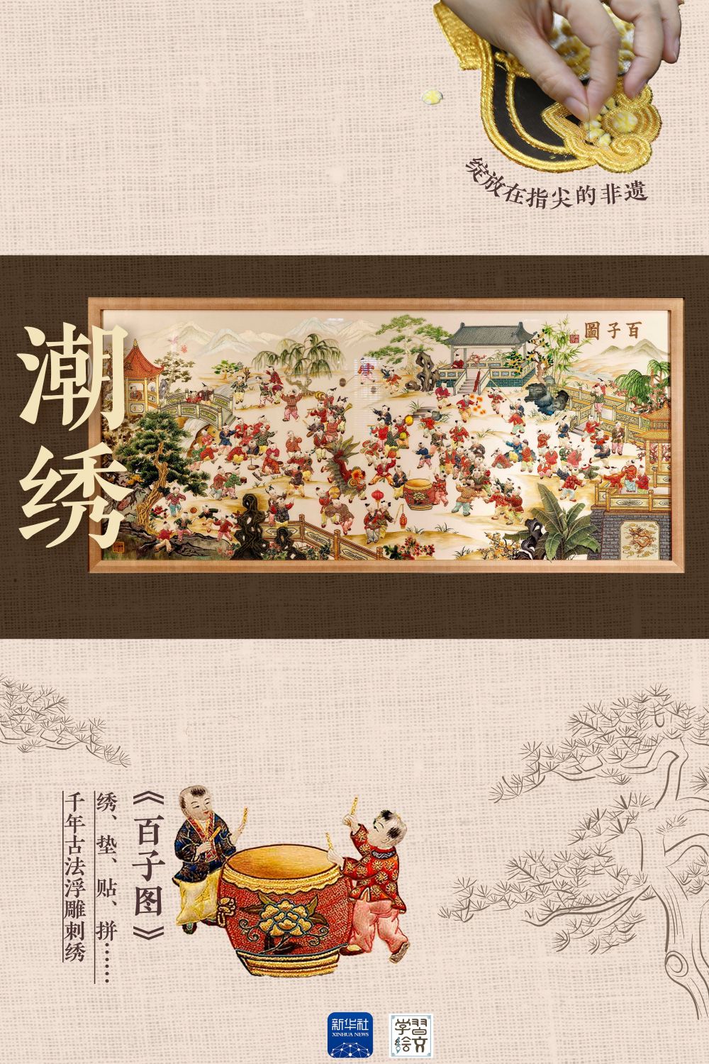 《百子圖》潮繡屏風(fēng)構(gòu)圖飽滿、均衡對(duì)稱,一百位童子或顰或喜、或斗蟀踢球、或敲鑼打鼓,形態(tài)各異、生動(dòng)傳神,是一幅高貴典雅的民間藝術(shù)珍品。