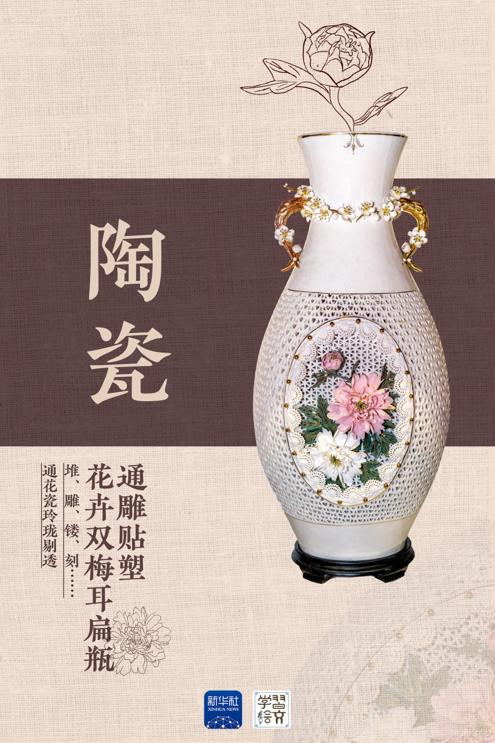 通花瓷器鏤空可達(dá)5層之多,或施于釉上彩繪,或與浮雕、立雕相結(jié)合,或配以色土、腐蝕金等裝飾,玲瓏剔透,娟麗秀美。有的瓷瓣片下水不沉,落地不碎。