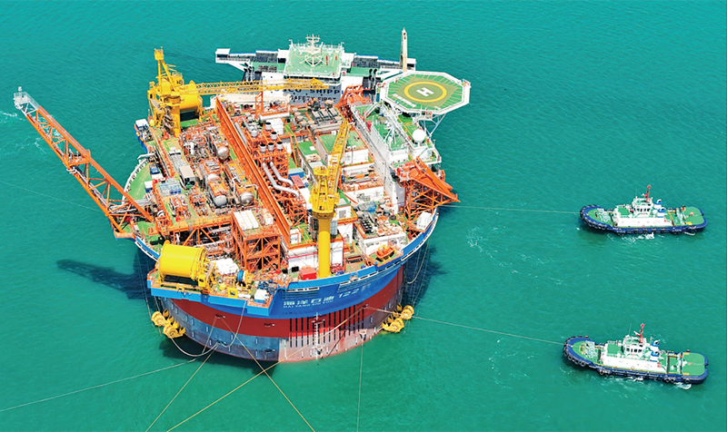 “??惶枴?,是亞洲首艘圓筒型浮式生產(chǎn)儲卸油裝置。該裝置集原油生產(chǎn)、存儲、外輸?shù)裙δ苡谝惑w,被網(wǎng)友們昵稱為“超級能源碗”,也是完全由我國自主設(shè)計建造的海上油氣加工廠。圖為2024年5月12日,“??惶枴睆闹袊S颓鄭u國際化高端裝備制造基地離港啟運。 人民圖片 張進(jìn)剛/攝
