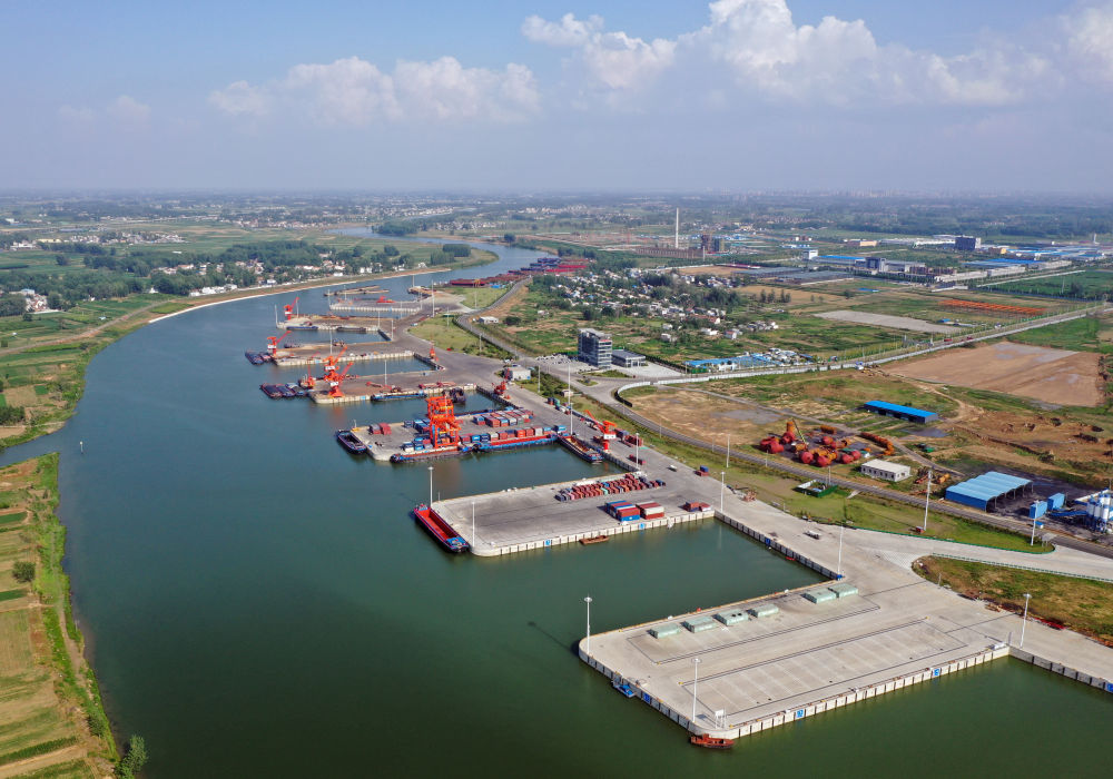 2022年6月28日拍攝的河南周口中心港碼頭(無人機(jī)照片)。近年來,河南積極推進(jìn)沙潁河航道升級改造,疏通內(nèi)河航運?,F(xiàn)在,從周口中心港出發(fā)的船舶可經(jīng)沙潁河至淮河、京杭大運河駛?cè)腴L江,讓內(nèi)陸城市亦能通江達(dá)海。