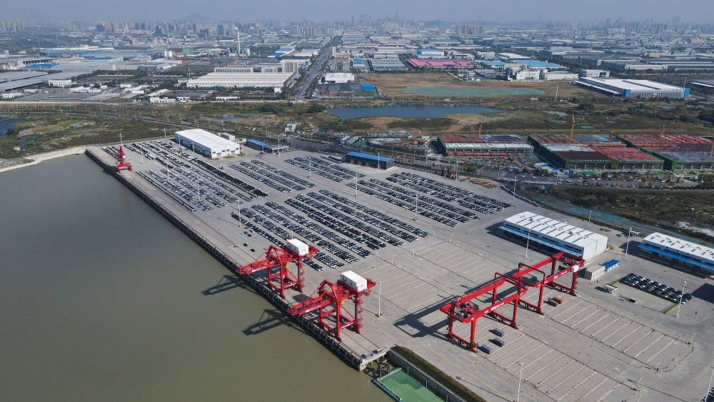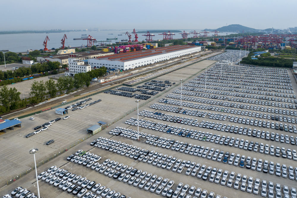 2024年5月26日,在安徽蕪湖港朱家橋港區(qū)國際集裝箱碼頭,整齊排列的汽車等待出口(無人機(jī)照片)。作為安徽省首個國家一類開放口岸,蕪湖港現(xiàn)已發(fā)展成為長三角城市群綜合交通運輸體系的重要樞紐。